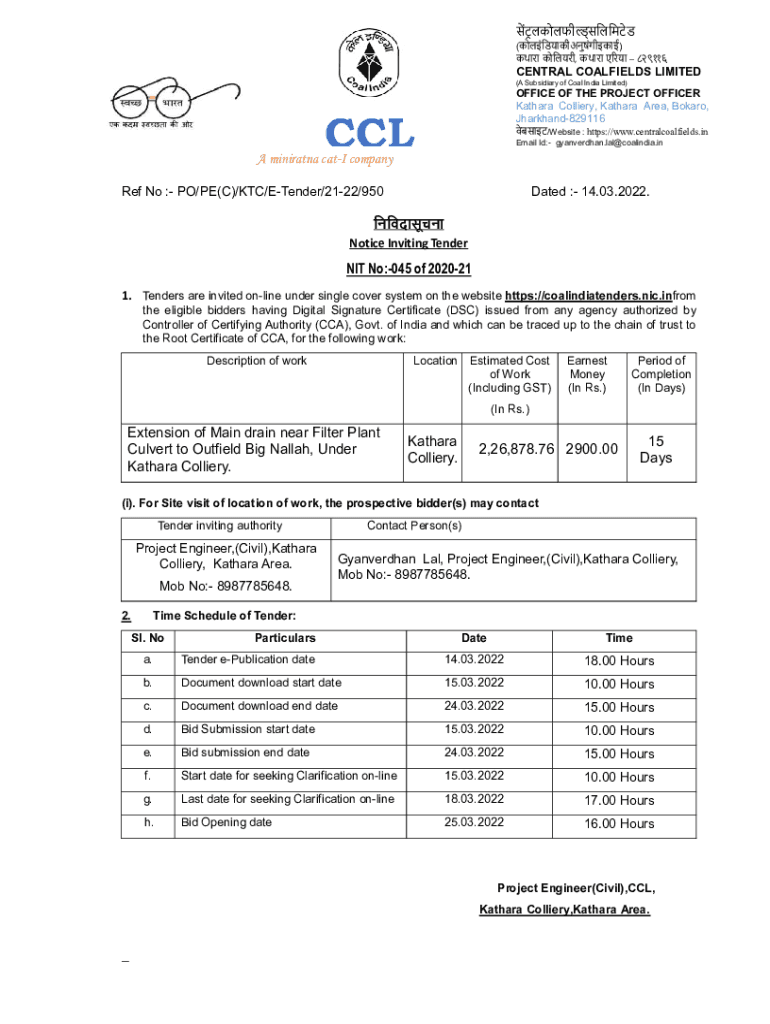 (), 1CENTRAL COALFIELDS LIMITED (A Subsidiary of Coal India Limited)OFFICE OF THE PROJECT OFFICER Sahara Colliery, Sahara Area, Board, Jharkhand829116ANCHI 834 029CCL/Website : https://www.centralcoalfields.in