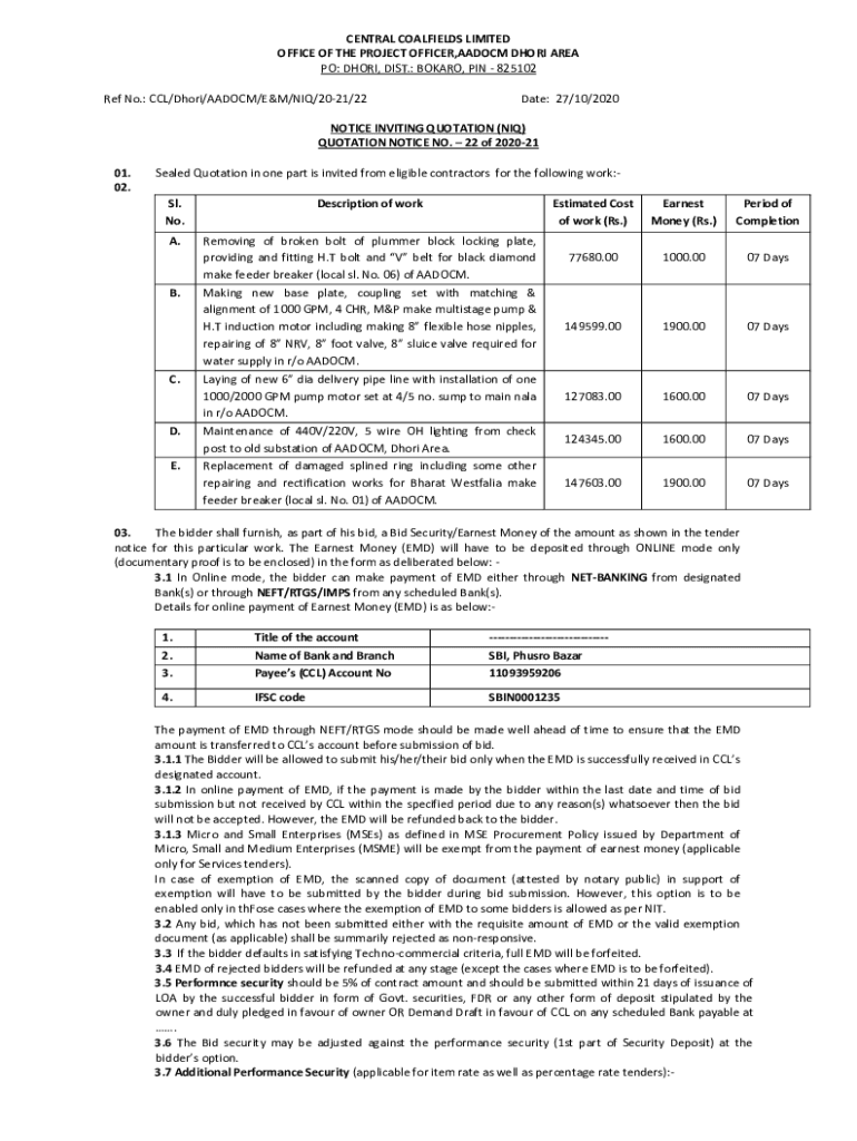 CENTRAL COALFIELDS LIMITED OFFICE OF THE PROJECT OFFICER, LADOM DHOTI AREA PO: DHOTI, DIST.: BOARD, PIN 825102 Ref No.: CCL/Dhoti/LADOM/E&M/IQ/2021/22Date: 27/10/2020NOTICE INVITING QUOTATION (IQ)