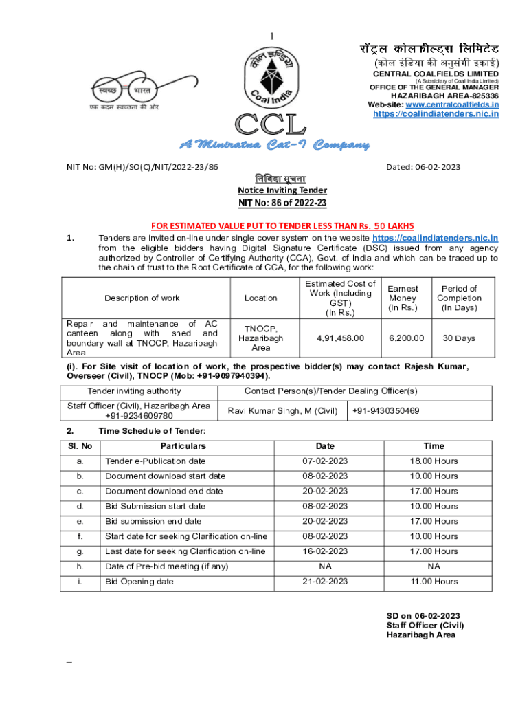 Website: www.centralcoalfields.inhttps://coalindiatenders.nic.inNIT No: GM(H)/SO(C)/NIT/202223/86Dated: