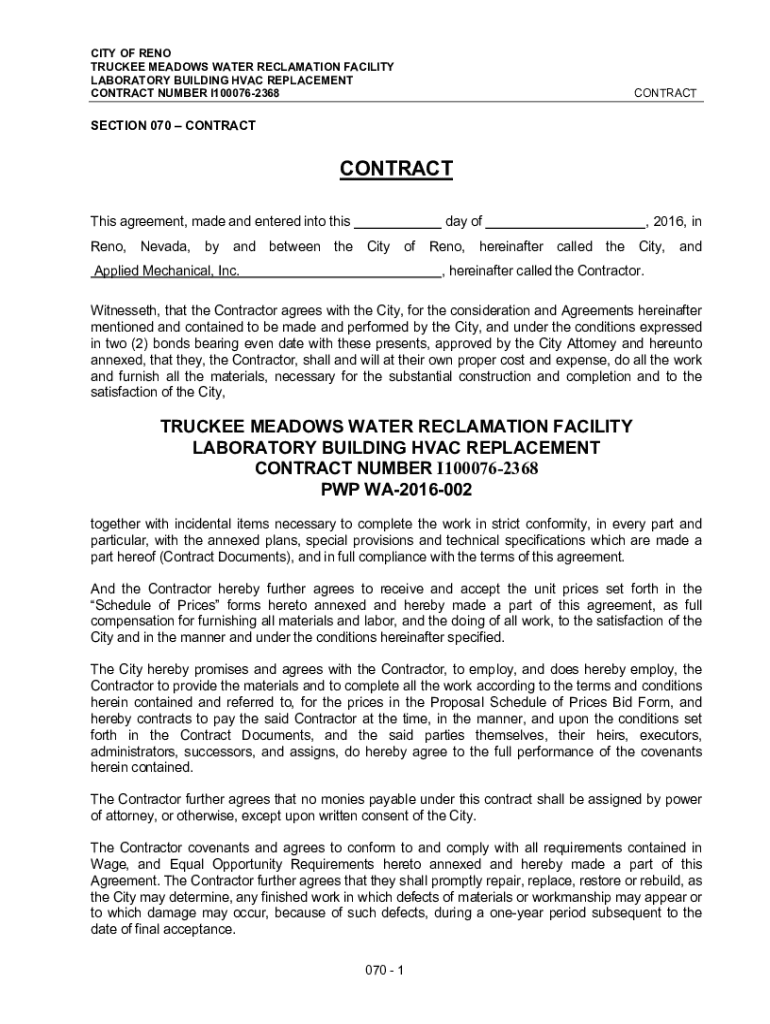 CITY OF RENO TRUCKEE MEADOWS WATER RECLAMATION FACILITY LABORATORY BUILDING HVAC REPLACEMENT CONTRACT NUMBER I1000762368CONTRACTSECTION 070 CONTRACTCONTRACT day this agreement, made and entered into