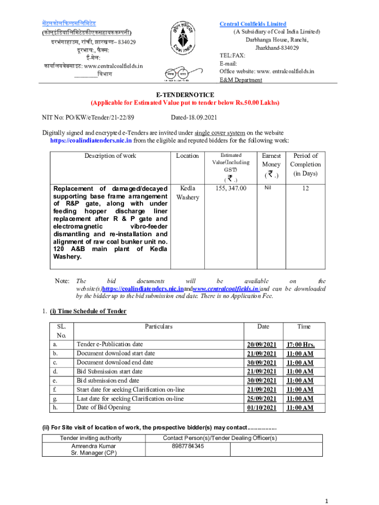 Central Coalfields Limited (A Subsidiary of Coal India Limited) Darshan House, Ranchi, Jharkhand834029 TEL:FAX: Email: Office website: WWW. Entralcoalfields.in E&M Department(), 834029 :, : : : www.centralcoalfields