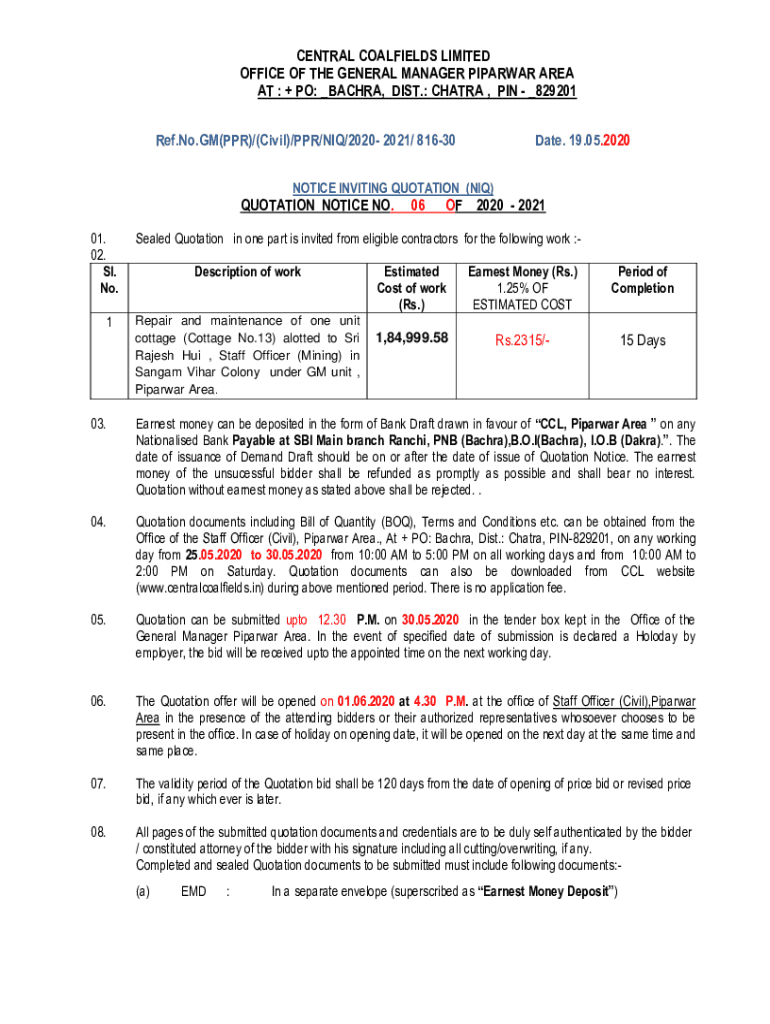 CENTRAL COALFIELDS LIMITED OFFICE OF THE GENERAL MANAGER RIPARIAN AREA AT : + PO: _BAC HRA, DIST.: CHAKRA, PIN _829201 Ref.No.GM(PPR)/(Civil)/PPR/IQ/2020 2021/ 81630Date. 19.05.2020NOTICE INVITING