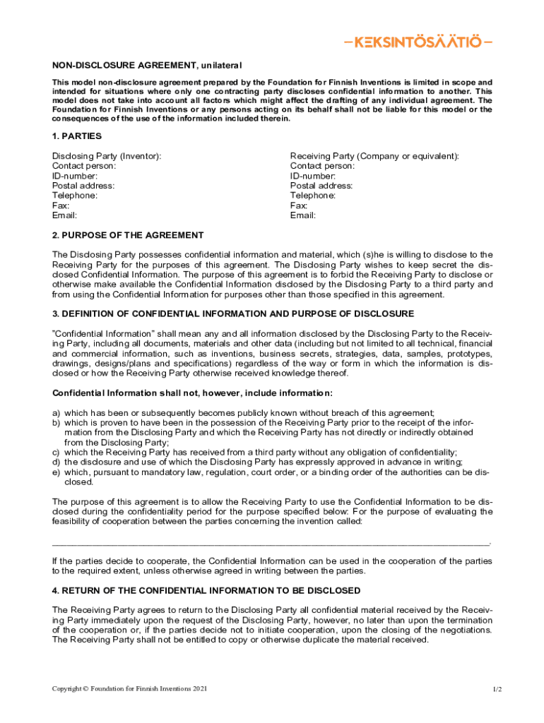 NONDISCLOSURE AGREEMENT, unilateral This model nondisclosure agreement prepared by the Foundation for Finnish Inventions is limited in scope and intended for situations where only one contracting