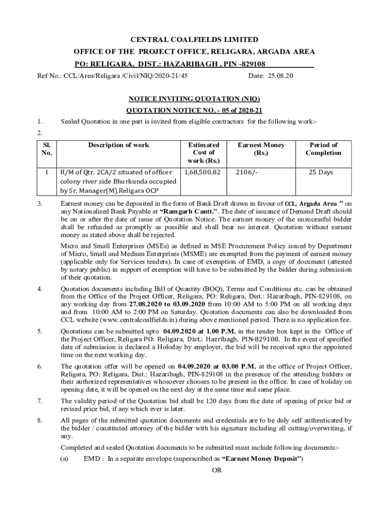 Ref No.: CCL/Area/Religion /Civil/IQ/202021/45Date: 25.08.20NOTICE INVITING