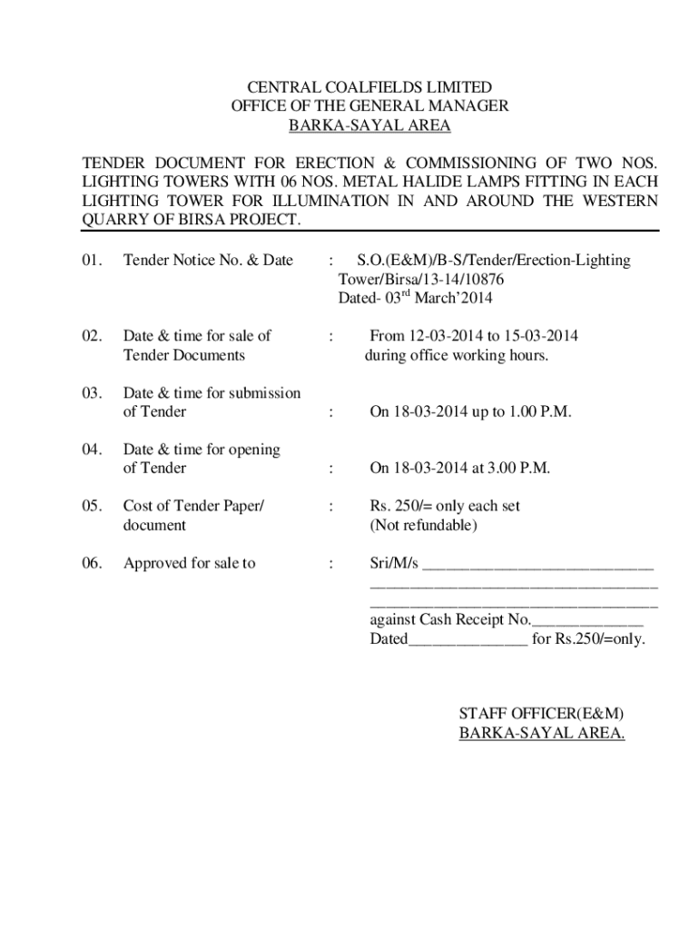 CENTRAL COALFIELDS LIMITED OFFICE OF THE GENERAL MANAGER BARKASAYAL AREA TENDER DOCUMENT FOR ERECTION & COMMISSIONING OF TWO NOS. LIGHTING TOWERS WITH 06 NOS. METAL HALITE LAMPS FITTING IN EACH LIGHTING