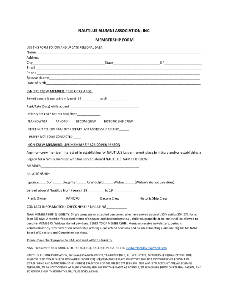 NAUTILUS ALUMNI ASSOCIATION, INC. MEMBERSHIP FORM USE THIS FORM TO JOIN AND UPDATE PERSONAL DATA. Name___ Address___ City___State___ZIP___ Email ___ Phone___ SpousesName___ Date of Birth___ SSN 571