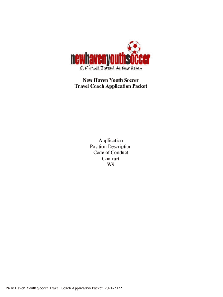 New Haven Youth Soccer Travel Coach Application PacketApplication Position Description Code of Conduct Contract W9New Haven Youth Soccer Travel Coach Application Packet, 20212022New Haven Youth Soccer
