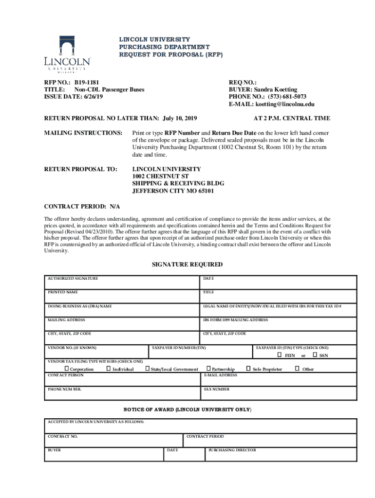 LINCOLN UNIVERSITY PURCHASING DEPARTMENT REQUEST FOR PROPOSAL (RFP)RFP NO.: B191181 TITLE: NonCDL Passenger Buses ISSUE DATE: 6/26/19REQ NO.: BUYER: Sandra Getting PHONE NO.: (573) 6815073 EMAIL: