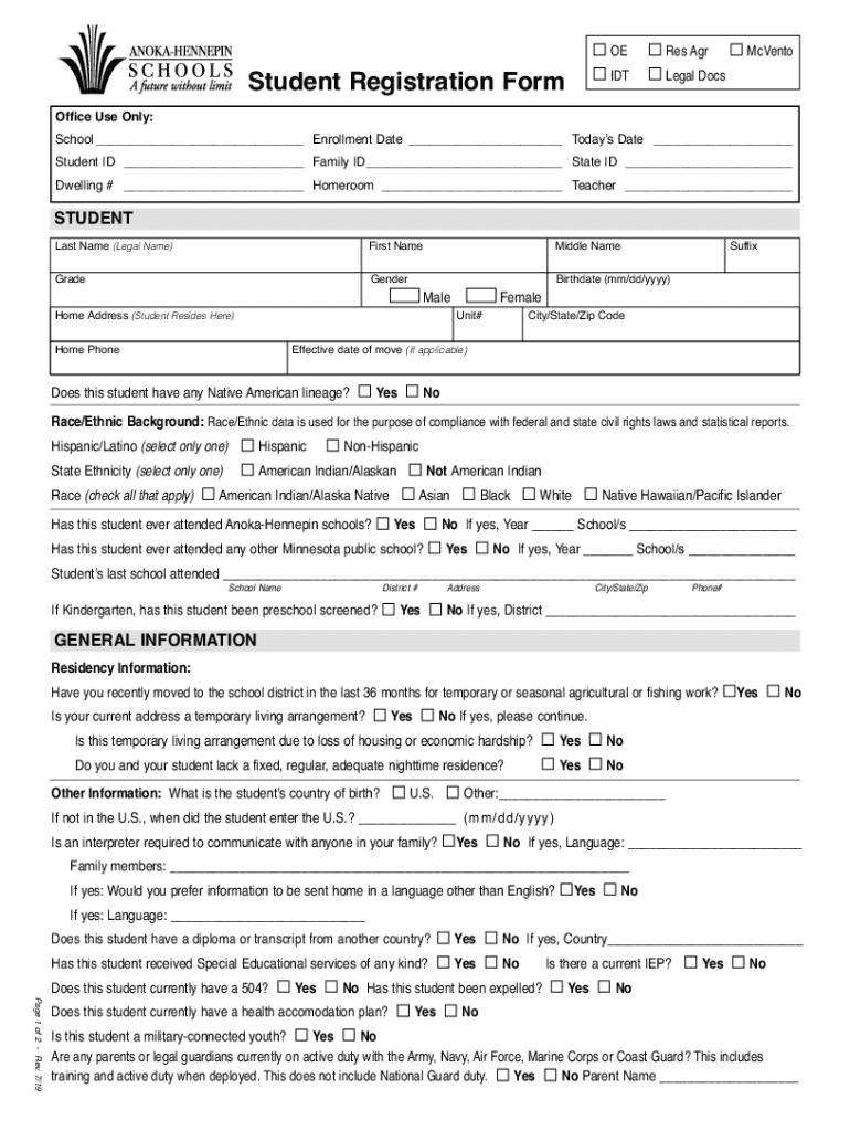 Student Registration FormOffice Use Only:Adores Legal DocsMcVentoSchool ___ Enrollment Date ___ Today's Date ___Student ID ___ Family ID ___ State ID ___ Dwelling # ___ Homeroom ___ Teacher ___Students