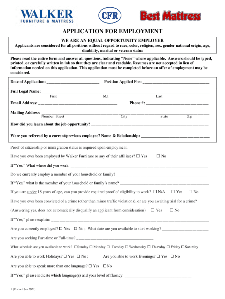 APPLICATION FOR EMPLOYMENT WE ARE AN EQUAL OPPORTUNITY EMPLOYER Applicants are considered for all positions without regard to race, color, religion, sex, gender national origin, age, disability, marital