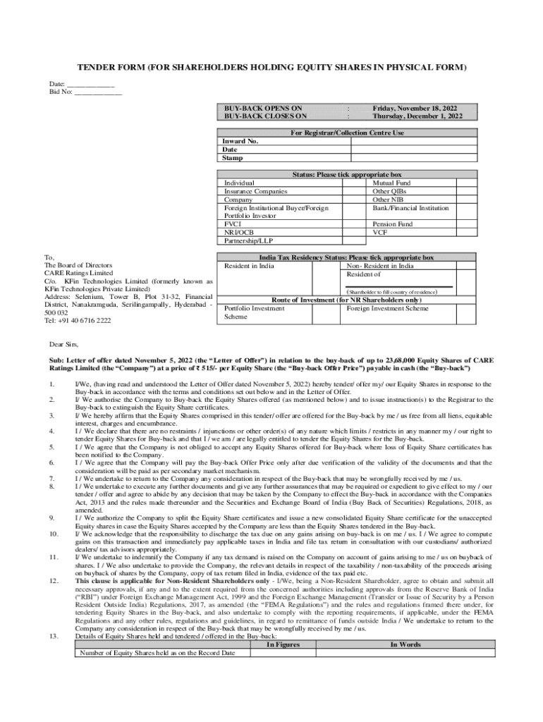 TENDER FORM (FOR SHAREHOLDERS HOLDING EQUITY SHARES IN PHYSICAL FORM) Date: ___ Bid No: ___ BUYBACK OPENS ON BUYBACK CLOSES ON: :Friday, November 18, 2022, Thursday, December 1, 2022For Registrar/Collection