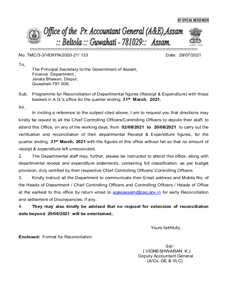 BY SPECIAL MESSENGER No. TMC/33/VERN/202021/ 133Date: 29/07/2021To, The Principal Secretary to the Government of Assam, Finance Department, Jana ta Shawn, Di spur, Guwahati781 006. Sub: Program for