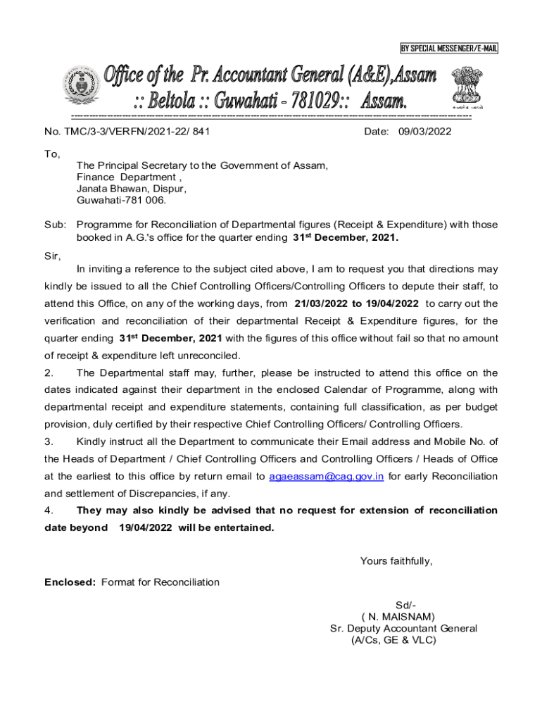 BY SPECIAL MESSENGER/EMAIL No. TMC/33/VERN/202122/ 841Date: 09/03/2022To, The Principal Secretary to the Government of Assam, Finance Department, Jana ta Shawn, Di spur, Guwahati781 006. Sub: Program