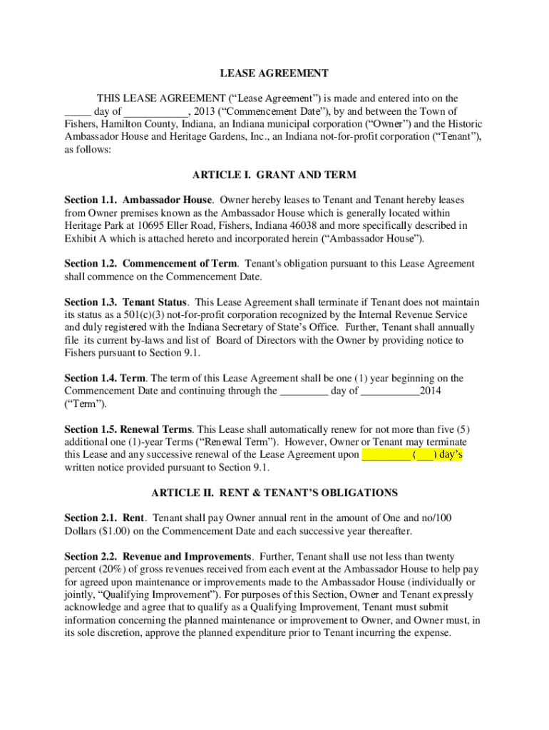LEASE AGREEMENT THIS LEASE AGREEMENT (Lease Agreement) is made and entered into on the ___ day of ___, 2013 (Commencement Date), by and between the Town of Fishers, Hamilton County, Indiana, an Indiana