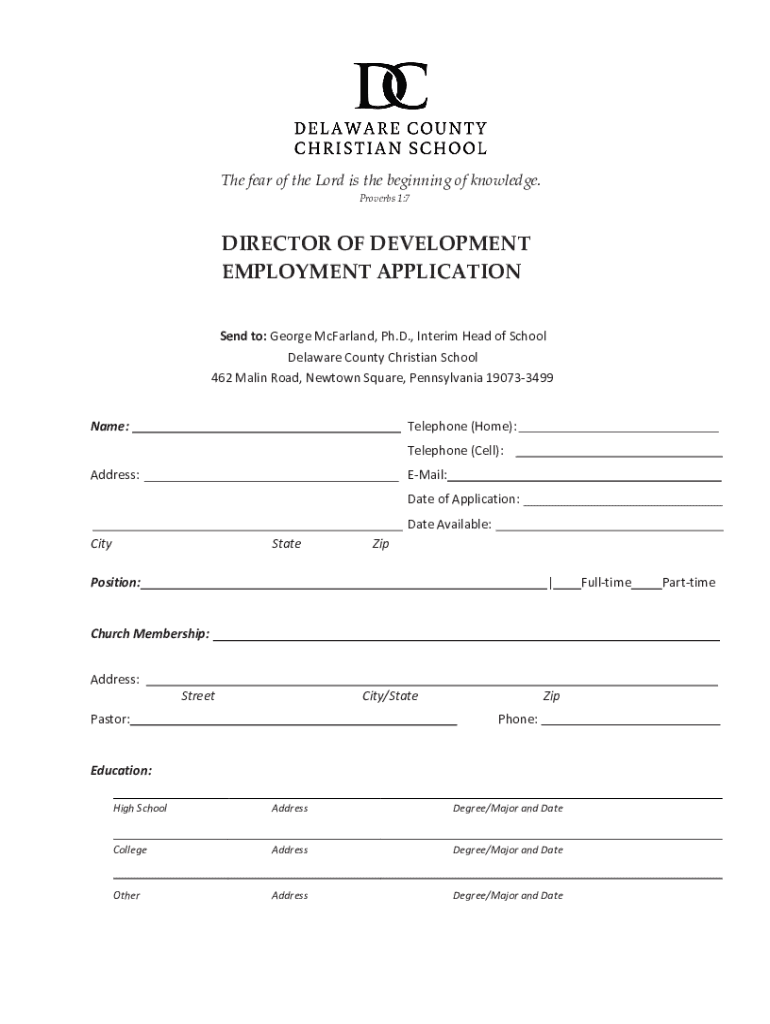 The fear of the Lord is the beginning of knowledge. Proverbs 1:7DIRECTOR OF DEVELOPMENT EMPLOYMENT APPLICATION Send to: George McFarland, Ph.D., Interim Head of School Delaware County Christian School
