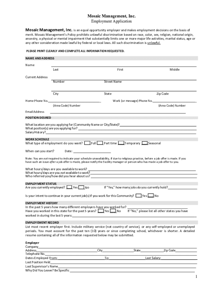 Mosaic Management, Inc. Employment Application Mosaic Management, Inc. is an equal opportunity employer and makes employment decisions on the basis of merit. Mosaic Managements Policy prohibits unlawful