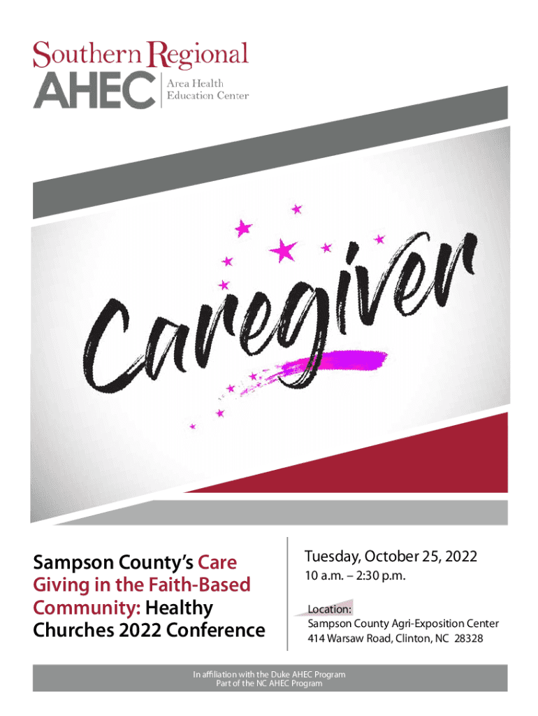 Sampson Counties Care Giving in the Fatheaded Community: Healthy Churches 2022 Conference Tuesday, October 25:202210 a.m. 2:30 p.m. Location: Sampson County AgriExposition Center 414 Warsaw Road,