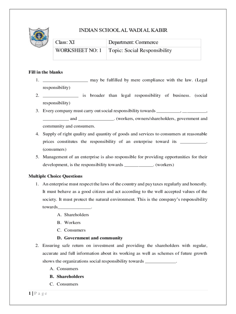 INDIAN SCHOOL AL WADI AL AIR Class: Department: CommerceWORKSHEET NO: 1Topic: Social ResponsibilityFill in the blanks 1. ___ may be fulfilled by mere compliance with the law. (Legal responsibility)