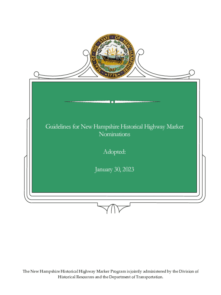 Guidelines for New Hampshire Historical Highway Marker Nominations Adopted: January 30, 2023The New Hampshire Historical Highway Marker Program is jointly administered by the Division of Historical