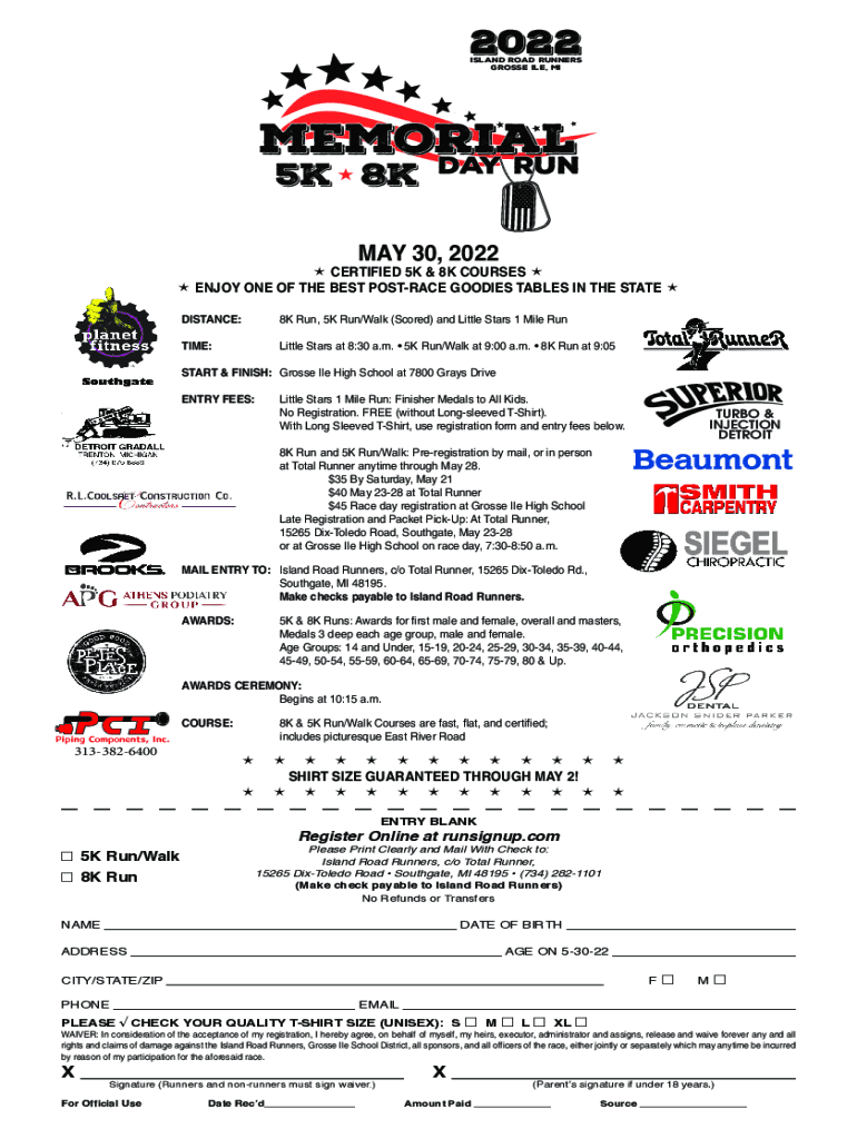 Island Road Runners Gross Mile, MI5K 8K MAY 30, 2022, CERTIFIED 5K & 8K COURSES ENJOY ONE OF THE BEST POSTAGE GOODIES TABLES IN THE STATE DISTANCE:8K Run, 5K Run/Walk (Scored) and Little Stars 1 Mile