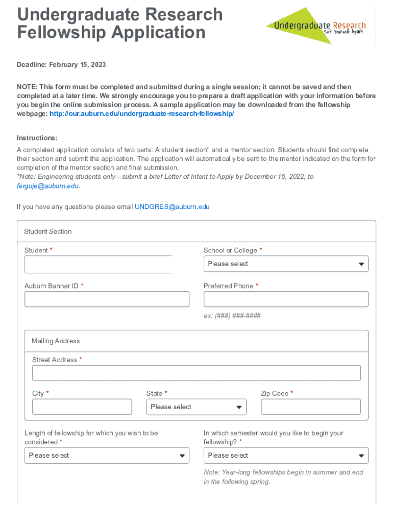 Undergraduate Research Fellowship Application Deadline: February 15, 2023, NOTE: This form must be completed and submitted during a single session; it cannot be saved and then completed at a later
