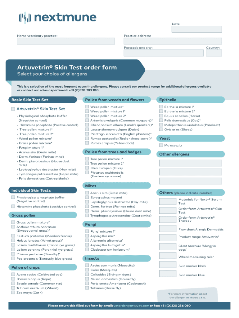 Date:Name veterinary practice:Practice address:Postcode and city:Country:Artuvetrin Skin Test order form