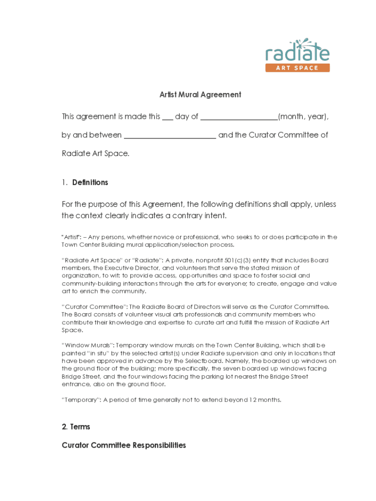 Artist Mural Agreement This agreement is made this ___ day of ___(month, year), by and between ___ and the Curator Committee of Radiate Art Space.1. Definitions For the purpose of this Agreement,