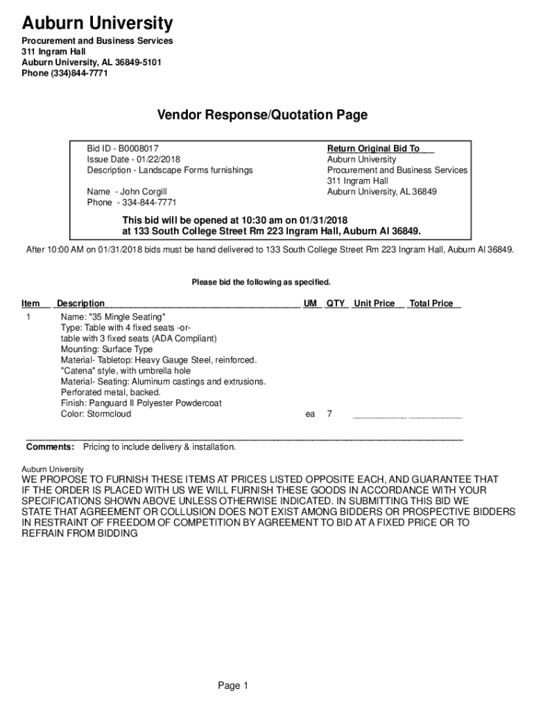 Auburn University Procurement and Business Services 311 Ingram Hall Auburn University, AL 368495101 Phone (334)8447771Vendor Response/Quotation Page Bid ID B0008017 Issue Date 01/22/2018 Description