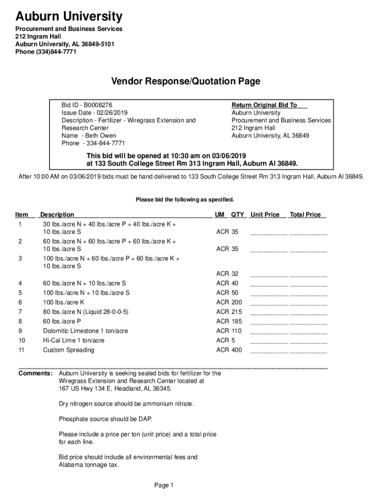Auburn University Procurement and Business Services 212 Ingram Hall Auburn University, AL 368495101 Phone (334)8447771Vendor Response/Quotation Page Bid ID B0008276 Issue Date 02/26/2019 Description