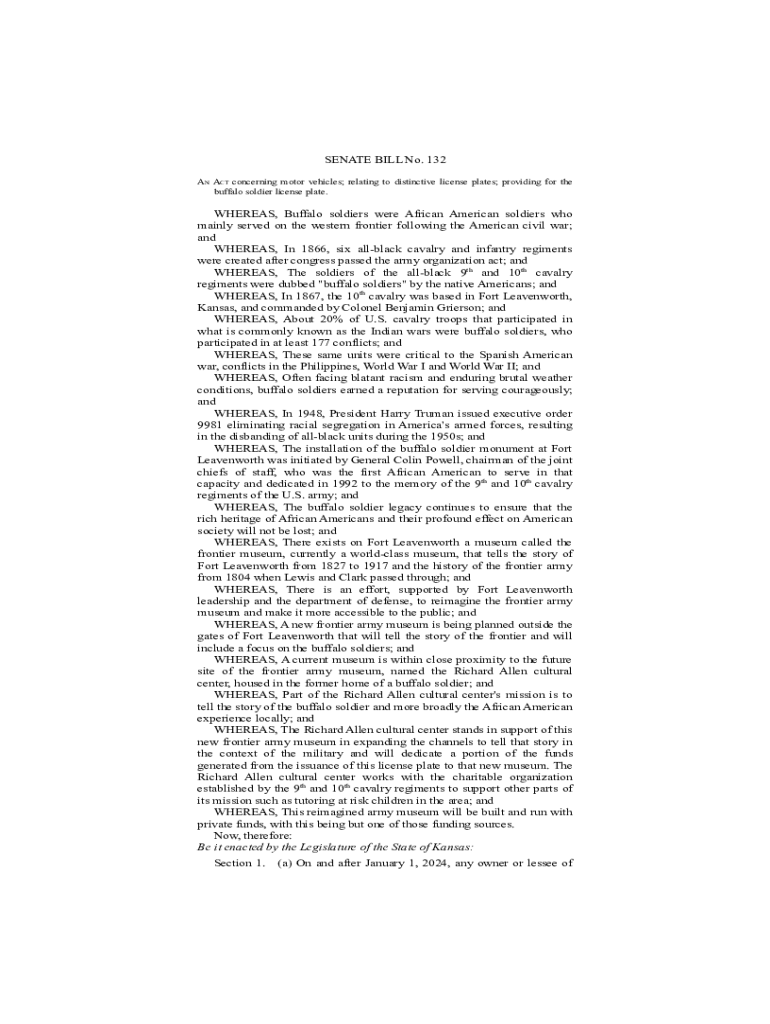 SENATE BILL No. 132 AN ACT concerning motor vehicles; relating to distinctive license plates; providing for the buffalo soldier license plate. WHEREAS, Buffalo soldiers were African American soldiers