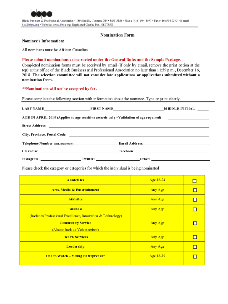 Black Business & Professional Association 180 Elm St., Toronto, ON M5T 3M4 Phone (416) 5044097 Fax (416) 5047343 Email: hja@bbpa.org Website: www.bbpa.org. Registered Charity No. 108073503Nomination
