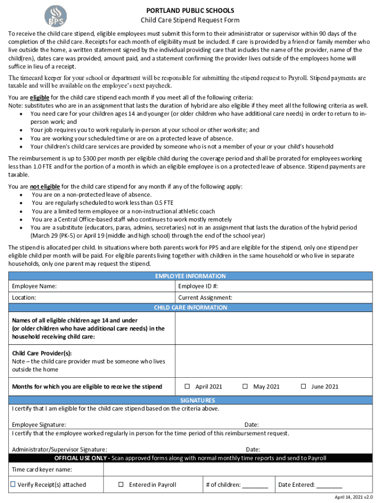 PORTLAND PUBLIC SCHOOLS Child Care Stipend Request Form To receive the child care stipend, eligible employees must submit this form to their administrator or supervisor within 90 days of the completion
