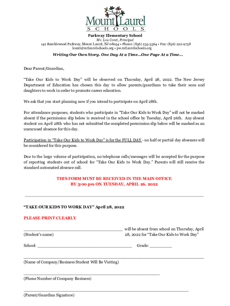 Parkway take our kids can be filled out online or on paper with information about the child's transportation to school.