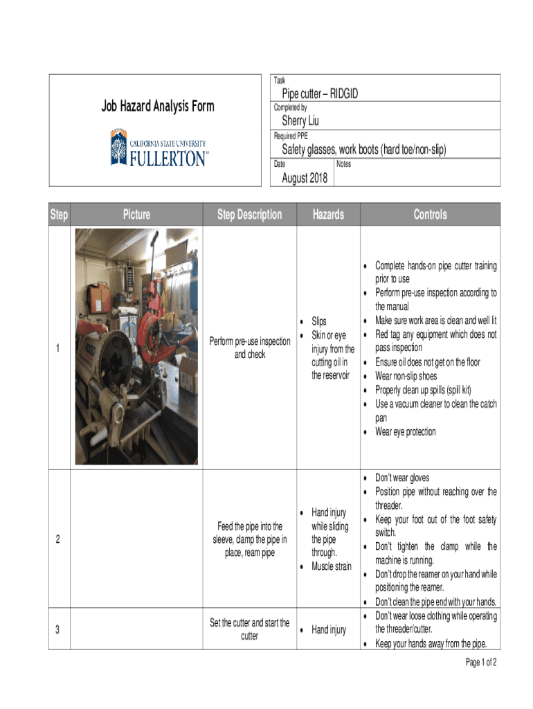 Task Job Hazard Analysis Hornpipe cutter RIGID Completed by Sherry Liu Required Safety glasses, work boots (hard toe/nonslip) DateNotesAugust 2018 StepPictureStep DescriptionHazardsControls 1Perform