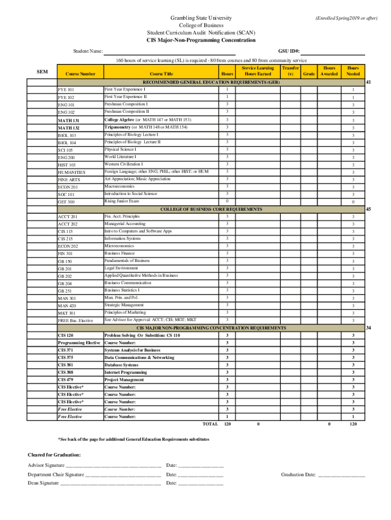 Gambling State University College of Business Student Curriculum Audit Notification (SCAN) CIS MajorNonProgramming Concentration(Enrolled Spring2019 or after)Student Name:CSU ID#: 160 hours of service
