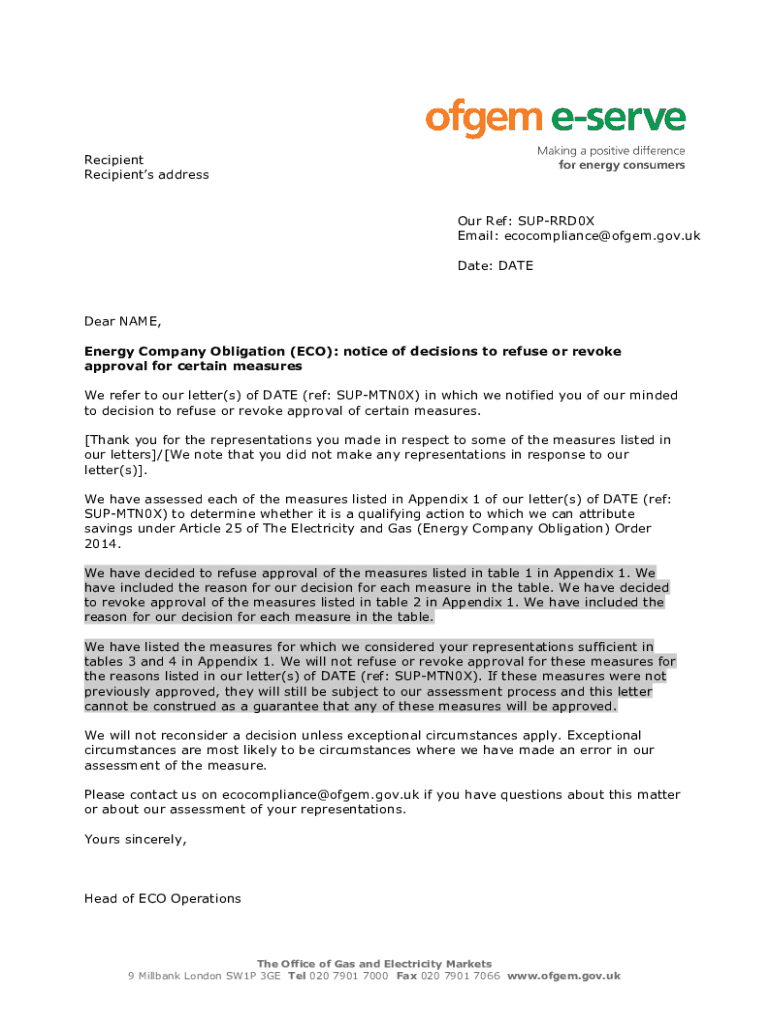 Recipient Recipients address Ref: SUPRRD0X Email: ecocompliance@ofgem.gov.uk Date: DATED ear NAME, Energy Company Obligation (ECO): notice of decisions to refuse or revoke approval for certain measures
