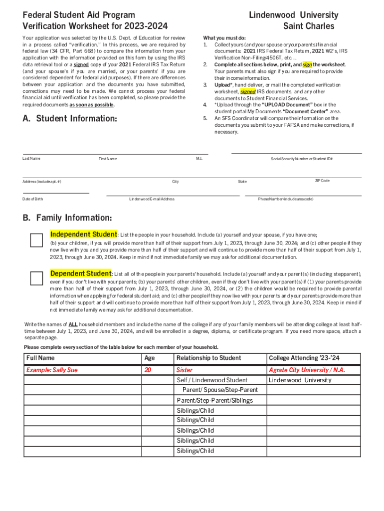Federal Student Aid Program Verification Worksheet for 20232024Lindenwood University Saint Charleston application was selected by the U.S. Dept. of Education for review in a process called verification.