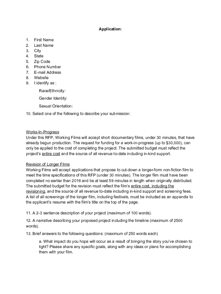 Application: 1. 2. 3. 4. 5. 6. 7. 8. 9. First Name Last Name City State Zip Code Phone Number Email Address Website I identify as : Race/Ethnicity: Gender Identity: Sexual Orientation:10. Select one