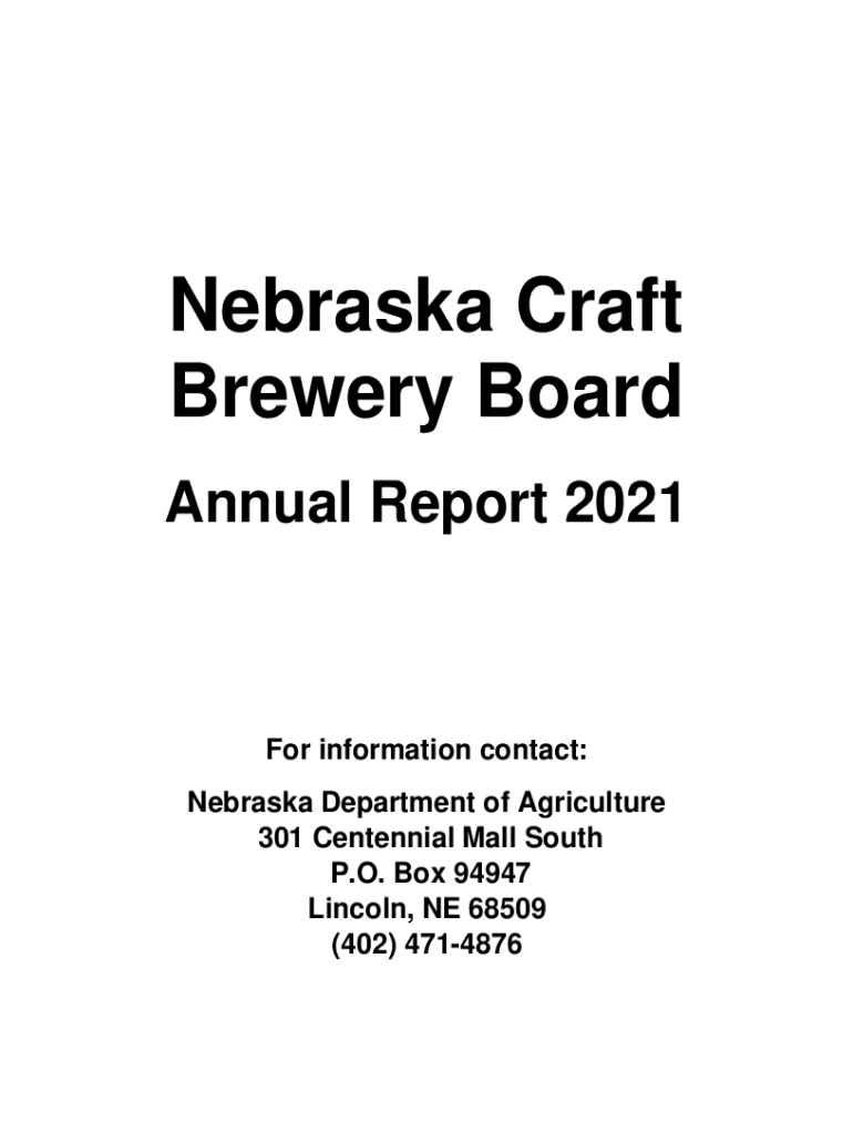 Nebraska Craft Brewery Board Annual Report 2021For information contact: Nebraska Department of Agriculture 301 Centennial Mall South P.O. Box 94947 Lincoln, NE 68509 (402) 4714876 1 Table of Contents