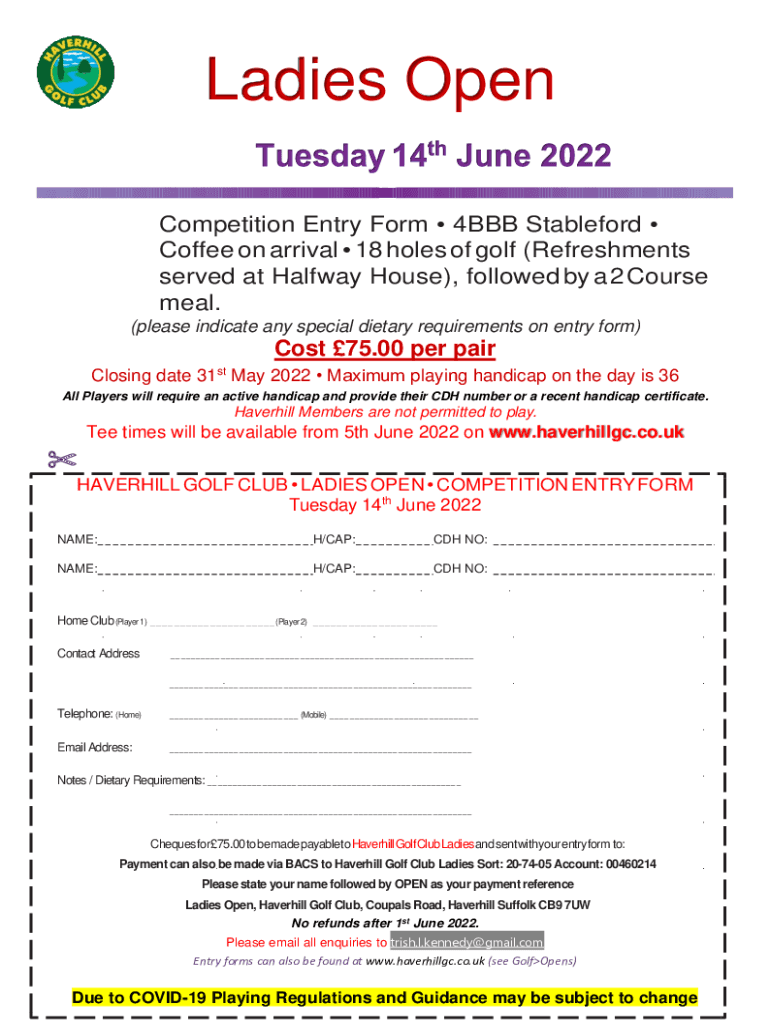 Ladies Open Competition Entry Form 4BBB Stable ford Coffee on arrival 18 holes of golf (Refreshments served at Halfway House), followed by a 2-Course meal. (please indicate any special dietary requirements