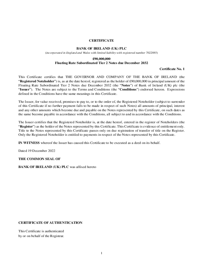 CERTIFICATE BANK OF IRELAND (UK) PLC (incorporated in England and Wales with limited liability with registered number 7022885)90,000,000 Floating Rate Subordinated Tier 2 Notes due December 2032 Certificate