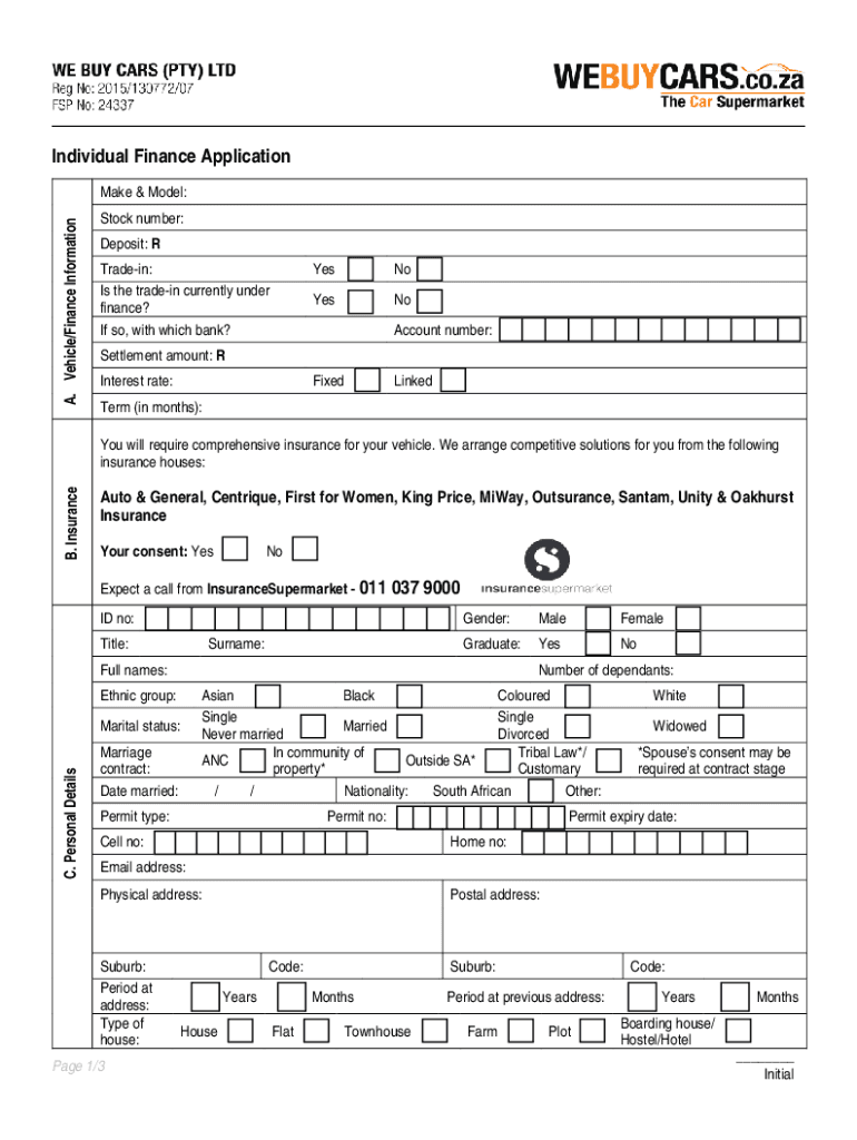 Individual Finance Application. Vehicle/Finance Informational & Model: Stock number: Deposit: R Trajan: Is the Trajan currently under finance? If so, with which bank? YesNoYesNo Account number:Settlement