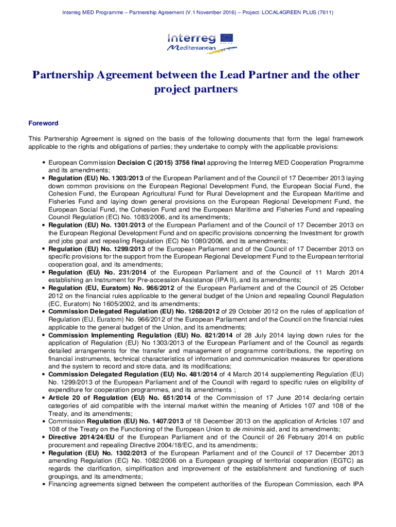 Interred MED Program Partnership Agreement (V.1 November 2016) Project: LOCAL4GREEN PLUS (7611)Partnership Agreement between the Lead Partner and the other project partners Foreword This Partnership