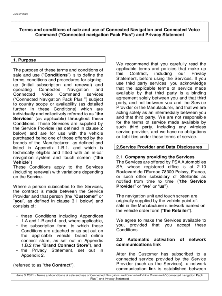 June 3rd 2021Terms and conditions of sale and use of Connected Navigation and Connected Voice Command (Connected navigation Pack Plus) and Privacy Statement1. Purpose The purpose of these terms and