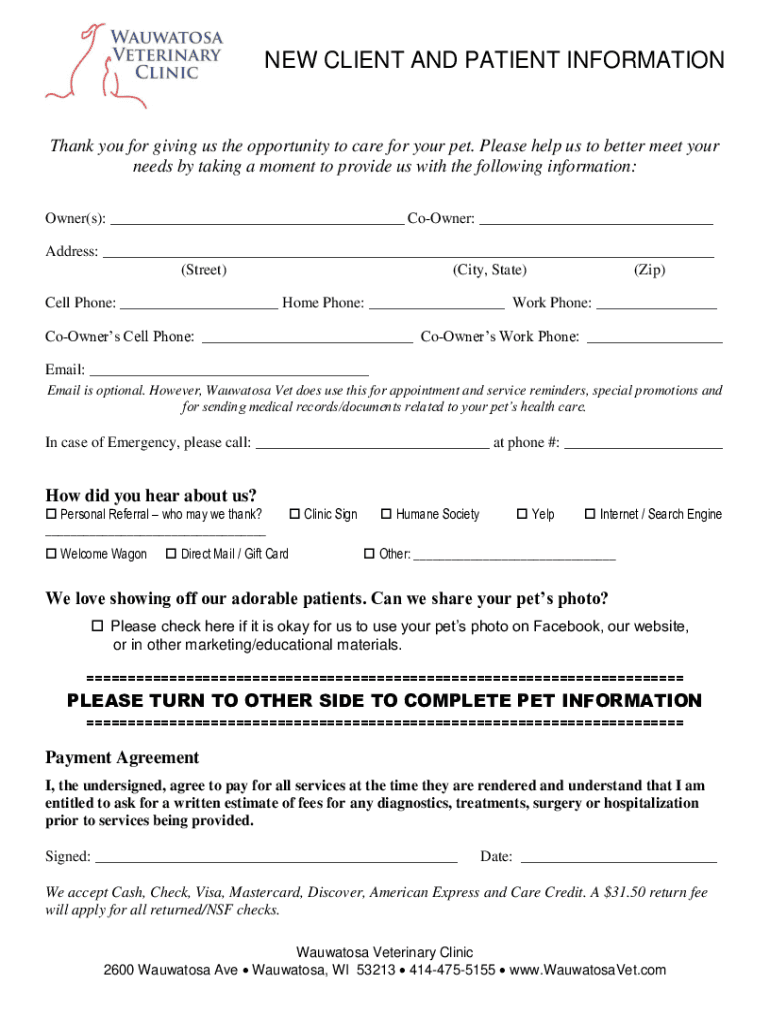 NEW CLIENT AND PATIENT INFORMATIONThank you for giving us the opportunity to care for your pet. Please help us to better meet your needs by taking a moment to provide us with the following information: