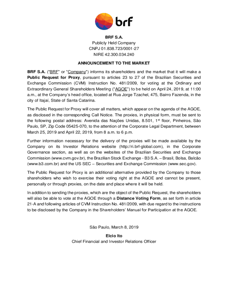 BRF S.A. Publicly Held Company CNJ 01.838.723/000127 NICE 42.300.034.240 ANNOUNCEMENT TO THE MARKET BRF S.A. (BRF or Company) informs its shareholders and the market that it will make a Public Request