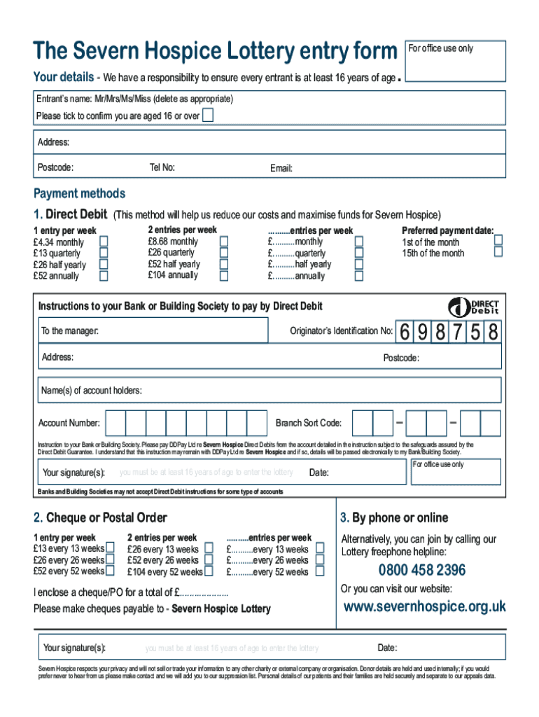 The Severn Hospice Lottery entry form Your details We have a responsibility to ensure every entrant is at least 16 years of for office use only. Entrants name: Mr/Mrs/Ms/Miss (delete as appropriate)