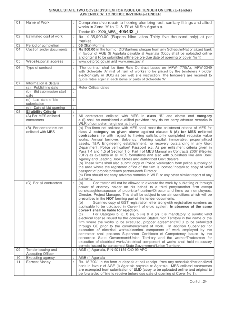 SINGLE STATE TWO COVER SYSTEM FOR ISSUE OF TENDER ON LINE (Tender) APPENDIX A TO NOTICE INVITING tender 01. Name of Work:02. Estimated cost of work:03. 04. Period of completion Cost of tender documents: