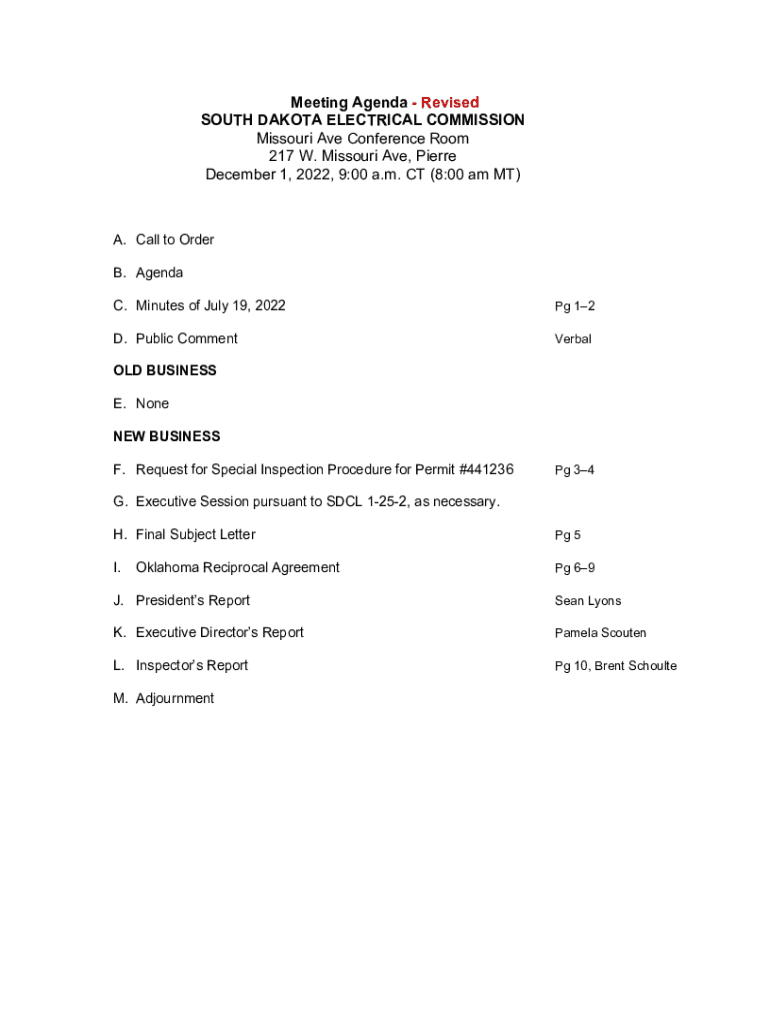 Meeting Agenda Revised SOUTH DAKOTA ELECTRICAL COMMISSION Missouri Ave Conference Room 217 W. Missouri Ave, Pierre December 1, 2022, 9:00 a.m. CT (8:00 am MT)A. Call to Order B. Agenda C. Minutes