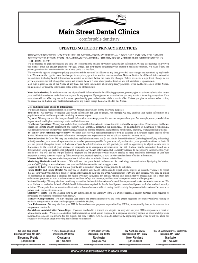 UPDATED NOTICE OF PRIVACY PRACTICES THIS NOTICE DESCRIBES HOW YOUR HEALTH INFORMATION MAY BE USED AND DISCLOSED AND HOW YOU CAN GET ACCESS TO THIS INFORMATION. PLEASE READ IT CAREFULLY. THE PRIVACY